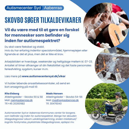 Vi søger en afdelingsleder, der med tydelig retning og respektfuld ledelse vil være med til at styrke indsatsen for borgere med autismespektrumforstyrrelser i eget hjem og i vores åbne væresteder – og samtidig skabe et attraktivt og udviklende arbejdsmiljø for medarbejderne.